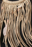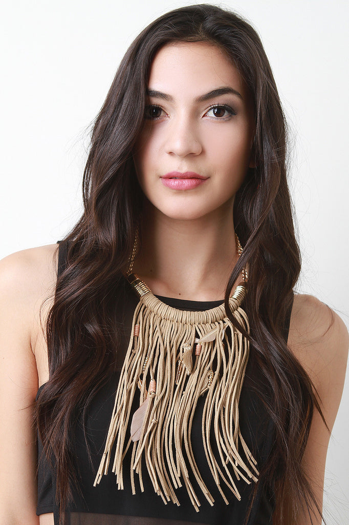 This statement necklace features vegan suede fringe, bead and feather accents, gold-tone chain, and adjustable lobster hook closure.