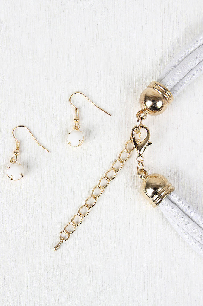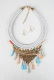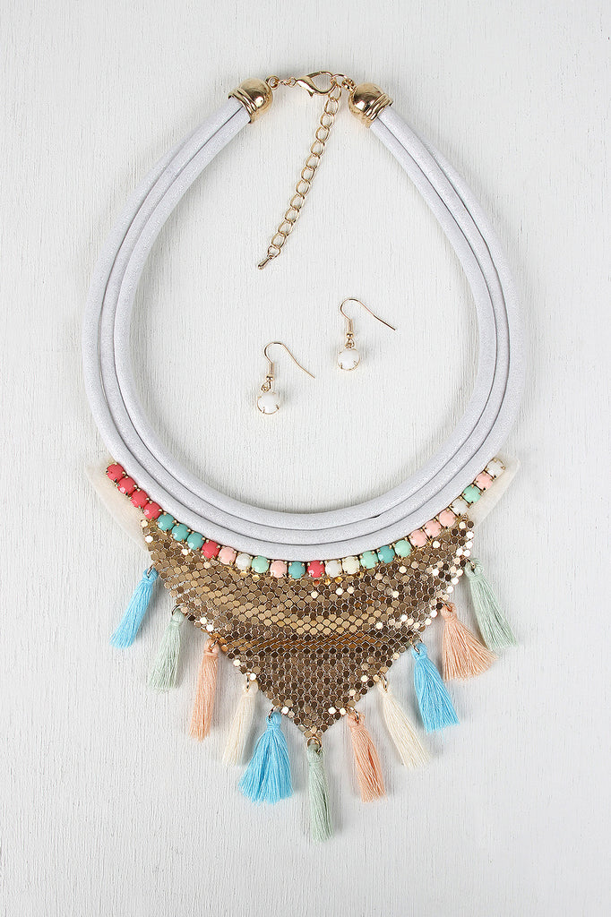 This bib style necklace features three shimmer accent cords, gemstone accents, gold-tone bib with fringe tassels, and adjustable lobster hook closure. Finished with matching earrings.