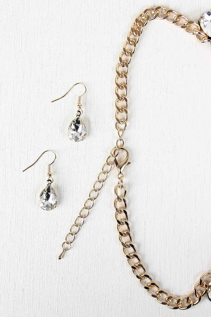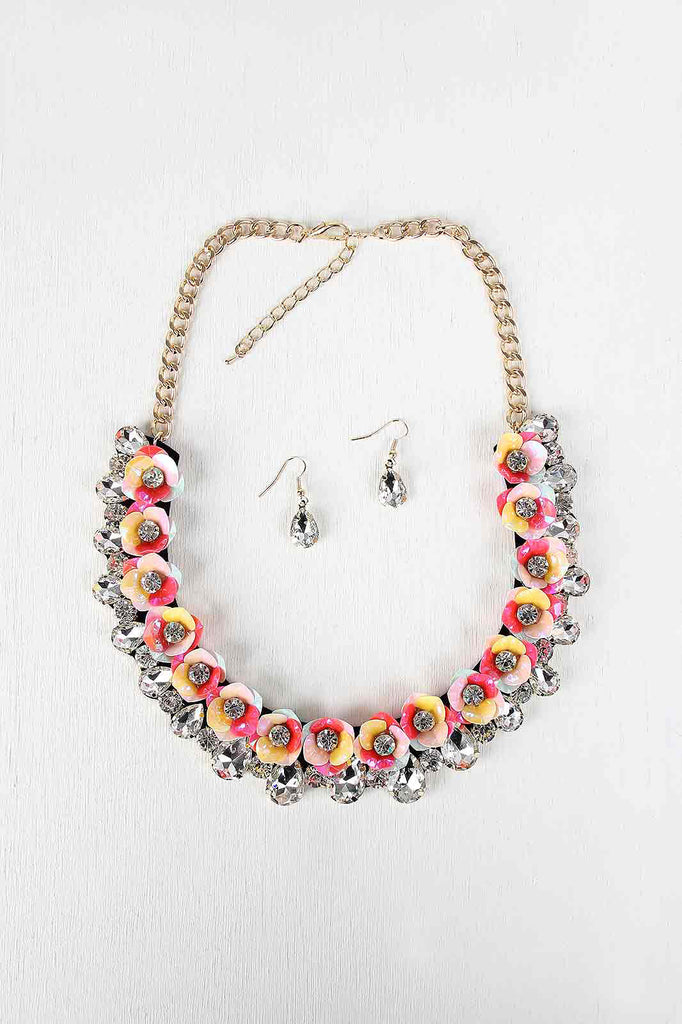 This necklace features gold-tone chain, flower charms, rhinestone accents, adjustable lobster hook closure, and finished with matching earrings.
