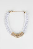 This bold statement necklace features tiny shimmer beads inside two-tone braided mesh, gold-tone wire wrapping, and adjustable lobster hook closure.
