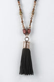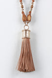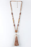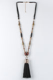 This necklace features beaded faux suede cords, large fringe tassel, and adjustable lobster hook closure.