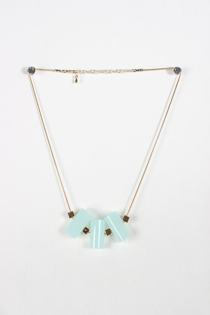 This necklace features a S link chain, vertical cylinder beads separated by gold tone cubes. Adjustable lobster claw closure.