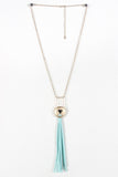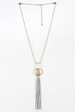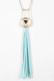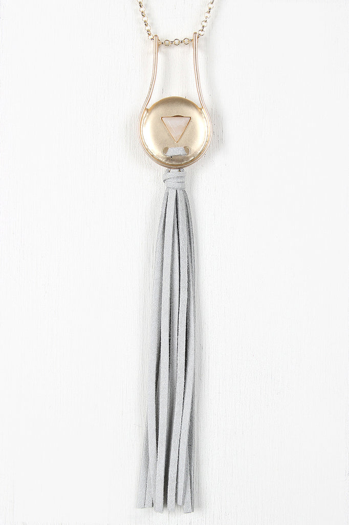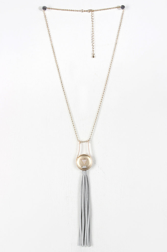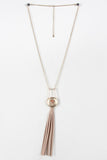 This necklace features delicate chain, matte metallic disc with protruding stone, vegan suede fringe tassel, and adjustable lobster hook closure.