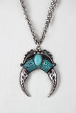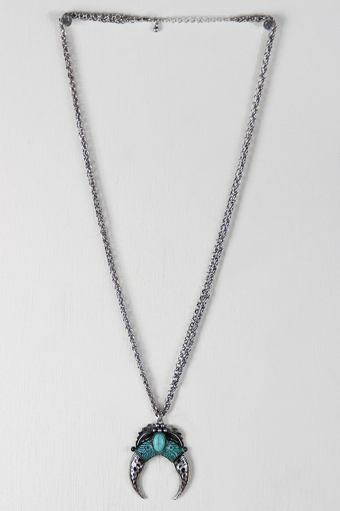 This necklace features double cable link chain, detailed crescent shaped pendant, and a faux turquoise stone centerpiece. Finished with adjustable lobster hook closure.