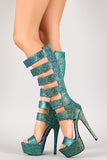 Featuring textured iridescent leatherette upper, open toe, chunky platform, strappy shaft, wrapped stiletto heel, rear zipper closure, and finished with cushioned insole for comfort.