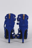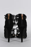 This open toe heel has an elasticized caged vamp that goes up and creates ankle straps. Designed with a rear back adjustable zipper closure. Finished with a ball of foot cushion insole.