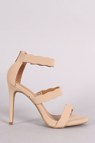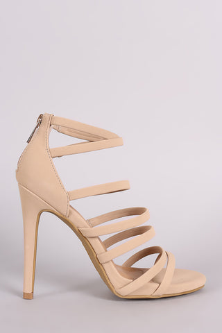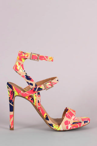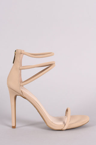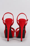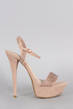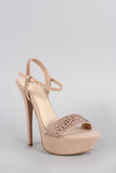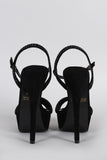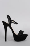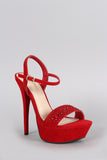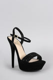 This glamorous heel features a smooth vegan suede upper, open toe silhouette, sparkling rhinestones accent, and stiletto heel. Finished with lightly padded insole and adjustable ankle strap with buckle fastening.