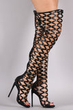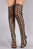 This exquisite heel features a strappy cutout design with decorative nail head studs throughout, open toe silhouette, low architectural platform, and stiletto heel. Finished with lightly padded insole and back zip closure.