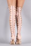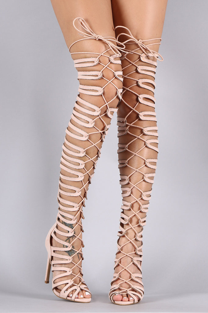 This thigh high lace-up construction, self-tie lace, zipper secure closure at back, stiletto heels, and lightly padded insole for comfort.