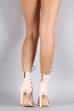 This lace-up style at ankles, open toe vamp with a single strap design, stiletto heels, zipper closure at back, and lightly padded insole for comfort.