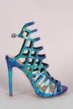 This stunning snake embossed hologram vegan leather throughout, peep toe silhouette, laser cutout design, and slingback strap with buckle fastening. Finished with low platform, wrapped stiletto heel, and lightly padded insole for comfort.
