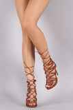 This striking heel features a crisscrossed laces corset the caged straps, peep toe silhouette, low platform, and wrapped stiletto heel. Finished with lightly padded insole and rear zipper closure for easy on/off.