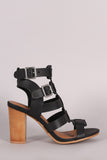 This heel features an open toe silhouette, strappy shaft construction with two adjustable buckles accent, chunky faux wooden heel, and lightly padded insole.