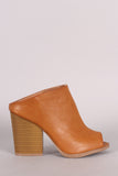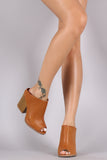 These heels feature a peep toe silhouette, center seam detail, chunky stacked heel, and lightly padded insole for comfort. Easy slip-on construction.