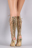 This heel features an open toe front, strappy silhouette, wrapped stiletto heel, and lightly padded insole. Finished with an elasticized lace up design at front and back for an adjustable fit.
