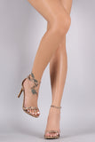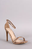This lovely open toe heel features a python print vegan leather throughout, single strap across vamp, and wrapped stiletto heel. Finished with lightly cushioned insole and adjustable ankle strap with buckle fastening.