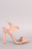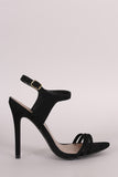 This stunning heel features an open toe silhouette, triple straps across vamp, wrapped stiletto heel, lightly padded insole, and adjustable ankle strap with buckle fastening.