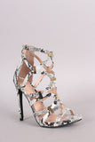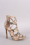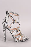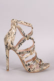 This eye-catching python print vegan leather upper, strappy vamp gather with gold-tone metal hardware embellishment, open toe silhouette, and wrapped stiletto heel. Finished with lightly padded insole and convenient back zip closure.