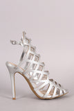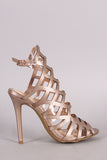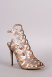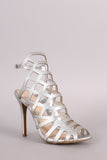 This striking heel features a cage-style silhouette with geometric cutout pattern, peep toe, and wrapped stiletto heel. Finished with lightly padded insole and adjustable slingback strap with buckle fastening.