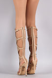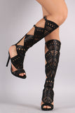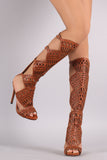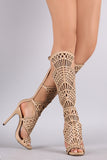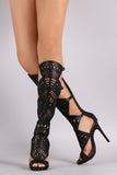 This stunning heel features a peep toe silhouette, geometric cutout design shaft with side buckle accent, low platform, and wrapped stiletto heel. Finished with lightly padded footbed and convenient back-zip closure.