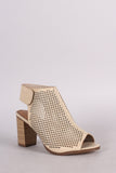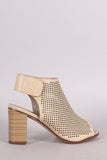 This stylish heel features a peep toe silhouette, perforated detail, back cutout design, hook & loop strap closure, chunky stacked heel, and lightly padded insole for comfort.