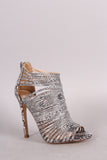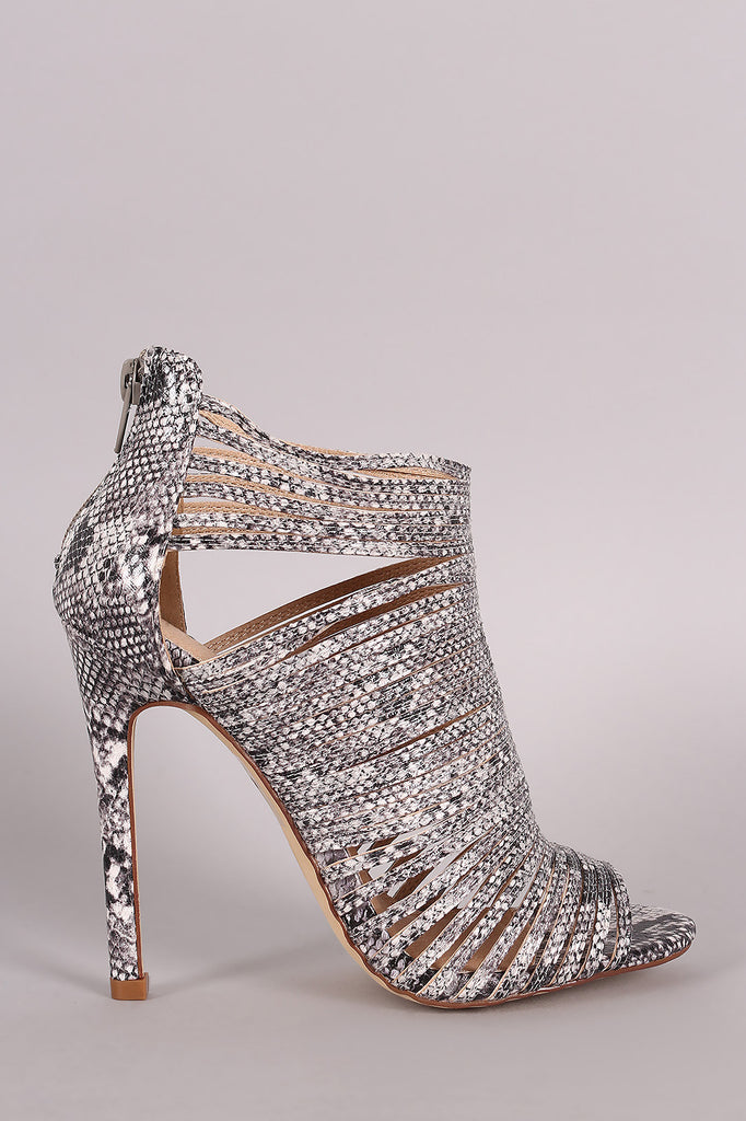 This stunning python print vegan leather throughout, peep toe silhouette, strappy caged design, and wrapped stiletto heel. Finished with lightly padded insole and convenient back zip closure.
