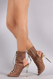 These lace up design and adjustable side zipper. Peep toe structure. Hidden platform. Finished on a gold reflective metallic heel.