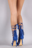 This edgy open toe heel features a tassel lace up front, covered tribute platform, and wrapped stiletto heel. Finished with lightly padded insole and convenient back zip closure.