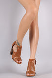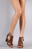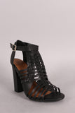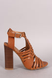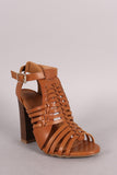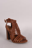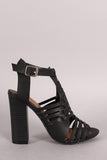 This trendy heel features a peep toe silhouette, strappy woven design vamp, and chunky stacked heel. Finished with lightly padded insole and adjustable ankle strap with side buckle closure.