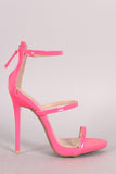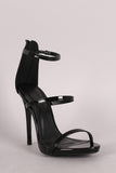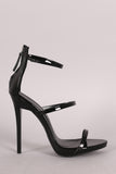This chic heel features three vegan leather strap, open toe silhoutte, and wrapped stiletto heel. Finished with lightly padded insole and convenient back-zip closure.