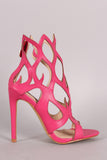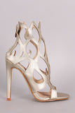This eye-catching heel features a fire-shaped cage design vamp, open toe silhouette, and wrapped stiletto heel. Finished with lightly padded insole and convenient back zip-closure.