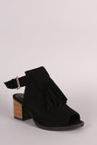 This edgy fringe detail at front, back cutout design with adjustable buckle closure, and chunky stacked heel. Finished with lightly cushioned insole for comfort.