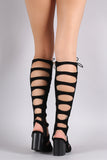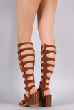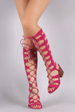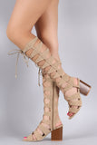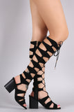 This fashionable heel features an open toe silhouette, strappy shaft with corset style lace up closure, stitching accents, and chunky stacked heel. Finished with lightly padded insole and side zipper closure for easy on/off.