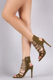This open toe heel has a strappy vamp, featuring upper elastic bands. Ankle is cuffed with a rear back opening and an adjustable side zipper.