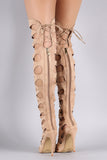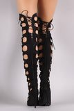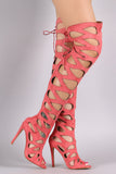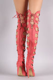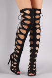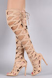 These stylish boots feature a keyhole cutout shaft with partial lace-up design at the back, peep toe silhouette, and wrapped stiletto heel. Finished with lightly padded insole and back-zip closure.