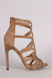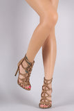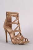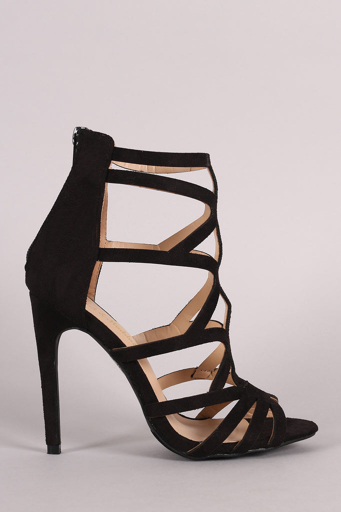 This stylish strappy caged construction vamp, and wrapped stiletto heel. Finished with lightly padded insole and rear zipper closure for easy on/off.