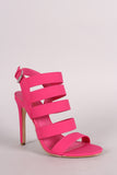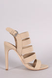 This irresistible heel features a strappy construction vamp, open toe silhouette, and wrapped stiletto heel. Finished with lightly padded insole and adjustable slingback strap with buckle fastening.