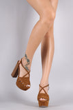 This chunky heeled open toe heel is on a faux wooden chunky heel and vegan suede covered platform. It is cross-strap construction with an adjustable ankle strap, featuring straps at toe box with an open toe design.