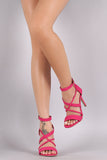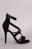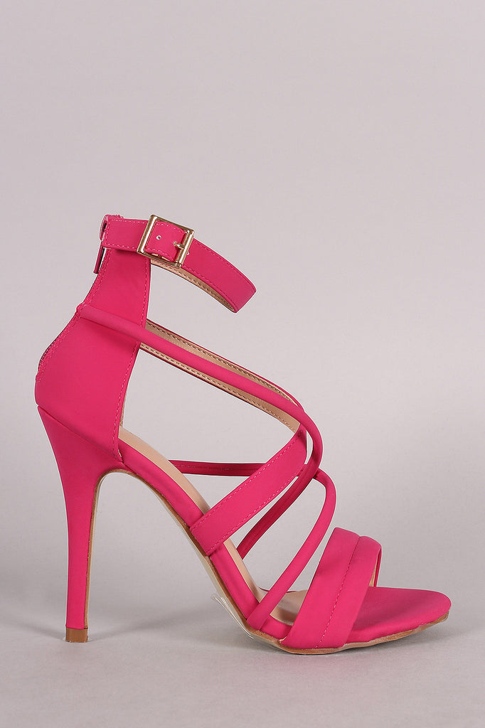This alluring heel features an ankle strap with adjustable buckle accent, crisscrossing straps design, and wrapped stiletto heel. Finished with lightly padded insole and convenient back-zip closure.