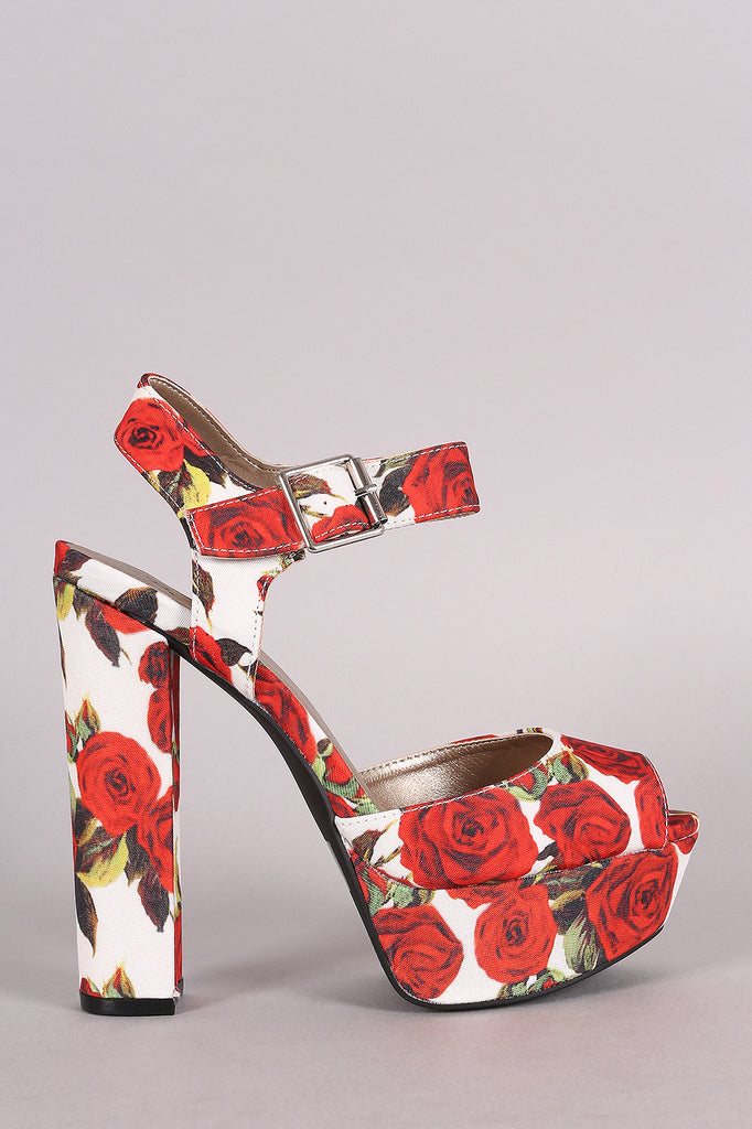 This gorgeous heel features a rosette print fabric upper, peep toe silhouette, tribute platform, and chunky wrapped heel. Finished with lightly padded insole and adjustable ankle strap with buckle fastening.