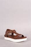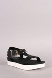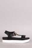 This open toe sandal is flatform silhouette with a cushioned sole. T-strap design featuring a metallic hardware along the adjustable ankle strap.