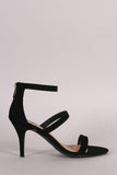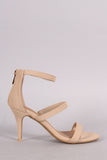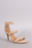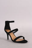 This open toe heel has three straps across the vamp, featuring an adjustable rear back zipper. Finished on a kitten heel.