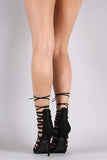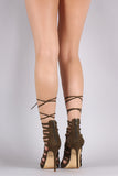 This strappy cage design; featuring, self tie laces and an adjustable rear back zipper.