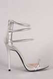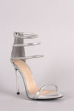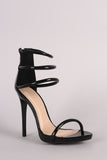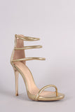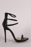 This eye catching heel features an open toe silhouette, triple ankle straps, wrapped stiletto heel, and rear zip-up closure. Finished with a lightly padded insole.