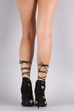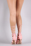 This gorgeous heel features a caged gladiator lace up vamp, zigzag cutout construction, peep toe silhouette, and wrapped stiletto heel. Finished with a lightly padded insole, and rear zipper fastener.
