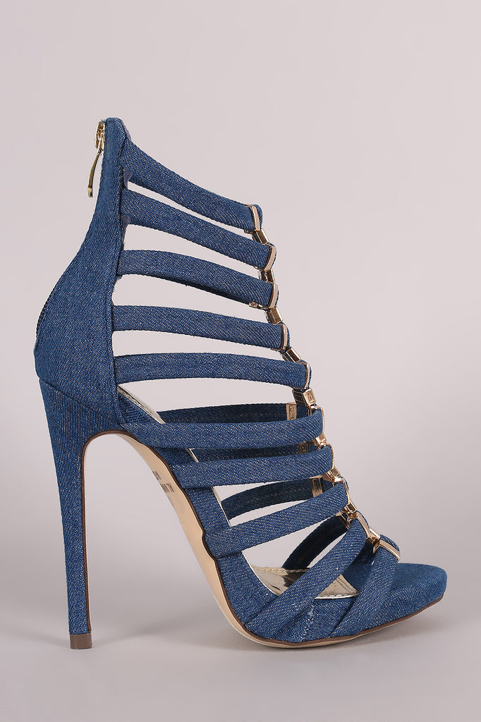 This stunning denim throughout with gold-tone hardware embellishment, open toe silhouette, low platform, and wrapped stiletto heel. Finished with lightly padded insole and rear zipper closure for easy on/off.