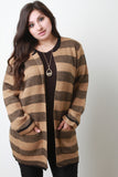 A structured plus size striped knit throughout, a round neckline, straight open front, and long sleeves. Finished with contrast color ribbed trim and front pockets. Accessories sold separately. 100% Acrylic.
