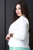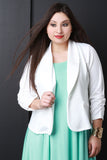A slightly glossy plus size jacket featuring a wide collar, three-quarter sleeves with ruched accent, and single button front closure. Finished with faux slip pockets. Accessories sold separately. Made in USA. 95% Polyester, 5% Spandex.