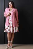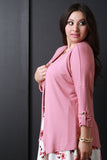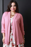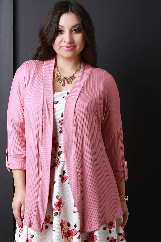 This versatile plus size cardigan features a ribbed knit fabrication, open front construction, drop shoulders, and finished with dolman button-tab sleeves. Accessories sold separately. Made in U.S.A. 97% Rayon, 3% Spandex.