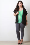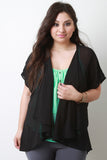 This plus size cardigan features semi-sheer fabrication, draped open front construction and short sleeves design. Finished with scrunched material in the back and high low hemline. Accessories sold separately. 100% Polyester.